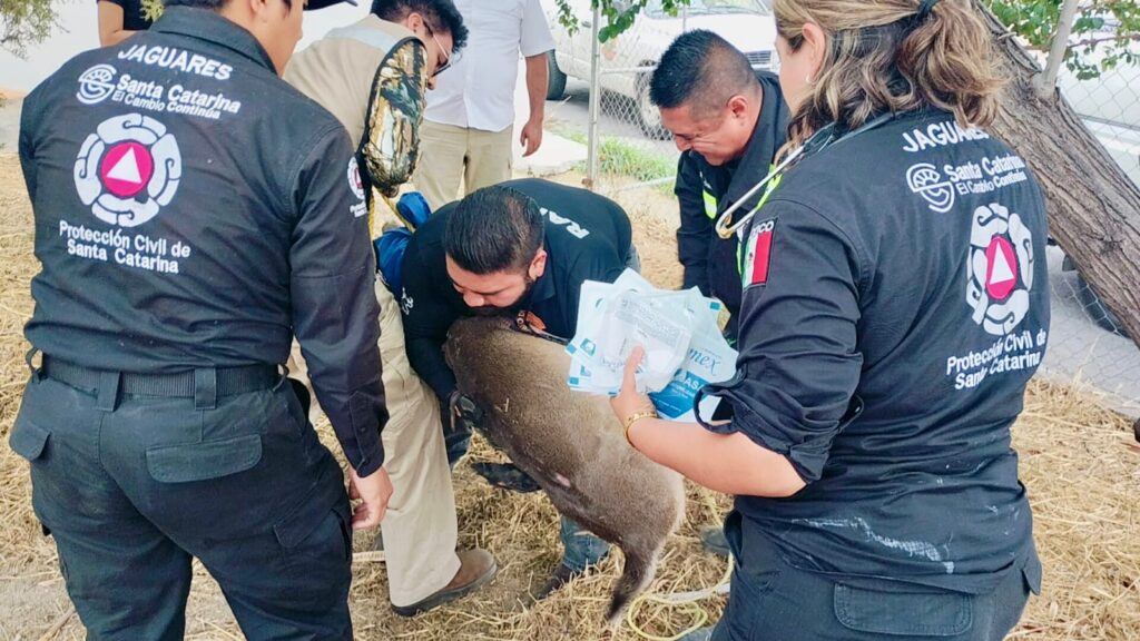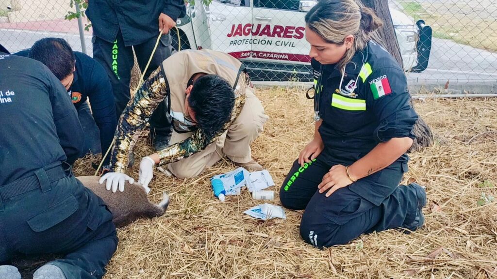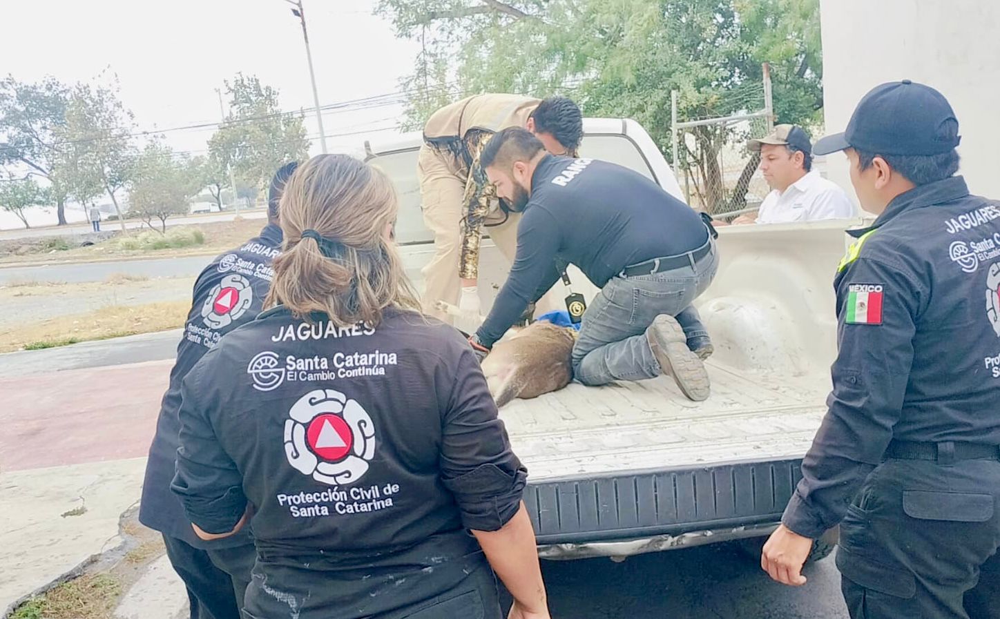Elementos de Protección Civil de Santa Catarina llamados también “jaguares”, realizaron el rescate de un venado que fue localizado merodeando en la parte trasera de una empresa, ubicada en la colonia Fraccionamiento El Obrero.