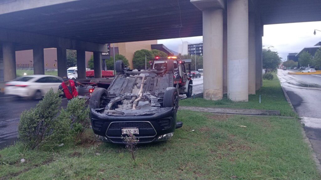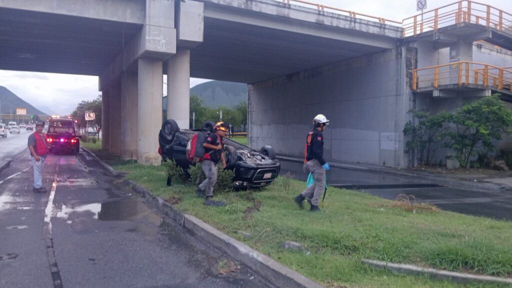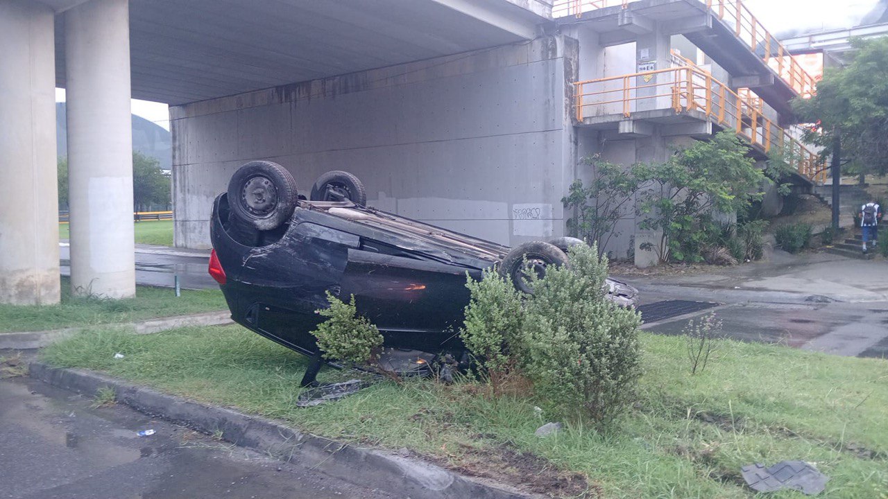 Un presunto cerrón por parte de otro vehículo provocó que el automóvil compacto que tripulaba una mujer terminara volcado, sobre el camellón lateral bajo el puente, luego de perder el control, al circular por la Carretera Nacional.