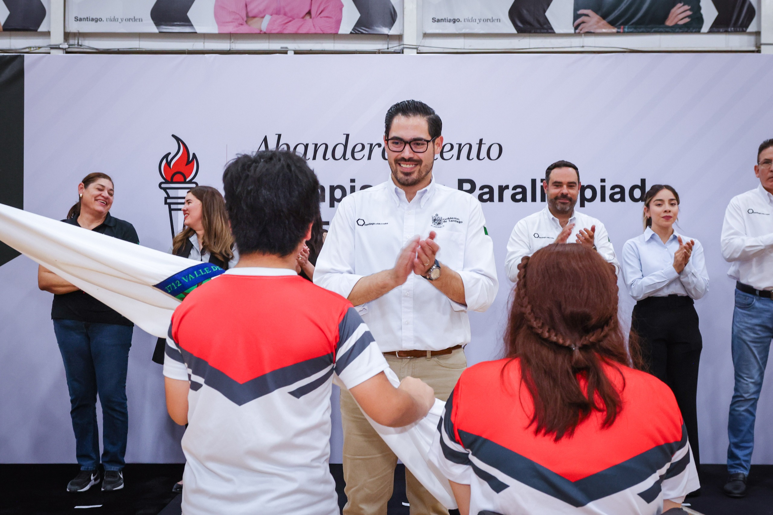 El Alcalde de Santiago, David de la Peña Marroquín, encabezó la ceremonia de abanderamiento de las delegaciones deportivas que representarán al municipio en la Olimpiada y Paralimpiada Estatal Nuevo León 2025, que se celebrarán del 4 de julio al 4 de agosto.