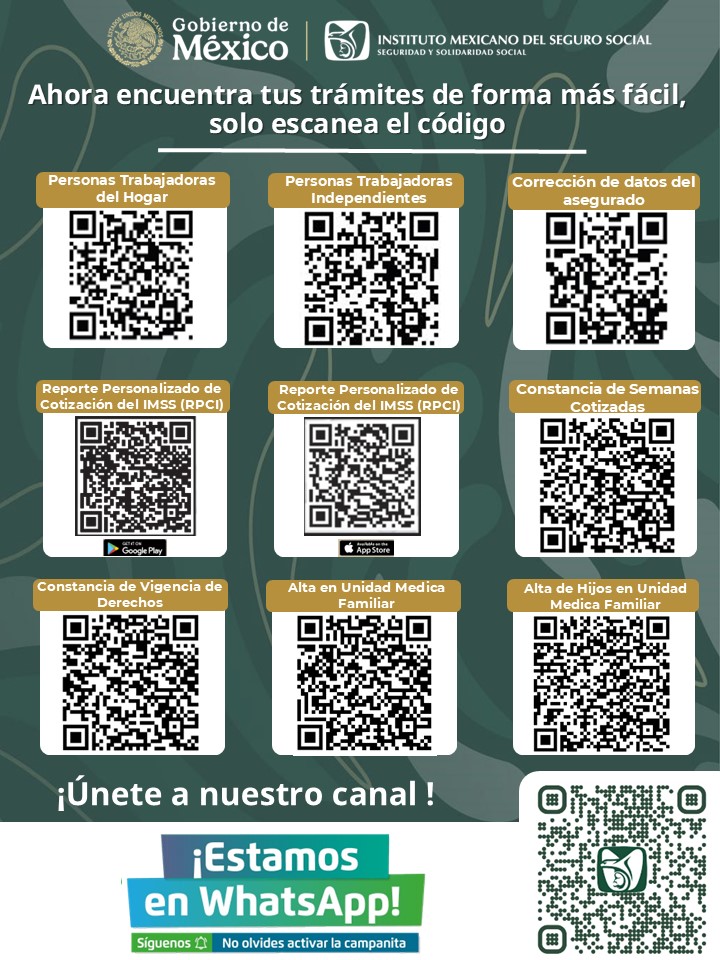 Con el objetivo de promover la digitalización, el autoservicio y reducir las cargas administrativas, el Instituto Mexicano del Seguro Social habilitó una serie de códigos QR que permiten a derechohabientes y patrones acceder de forma inmediata y segura a diversos trámites y servicios desde sus dispositivos móviles, sin necesidad de acudir a las oficinas del Instituto.