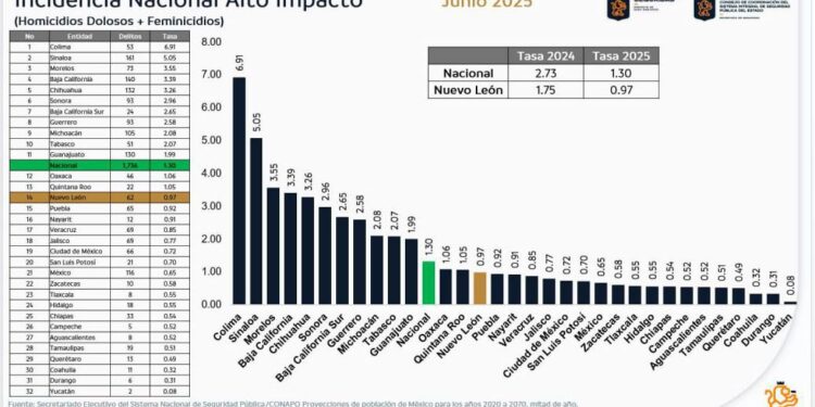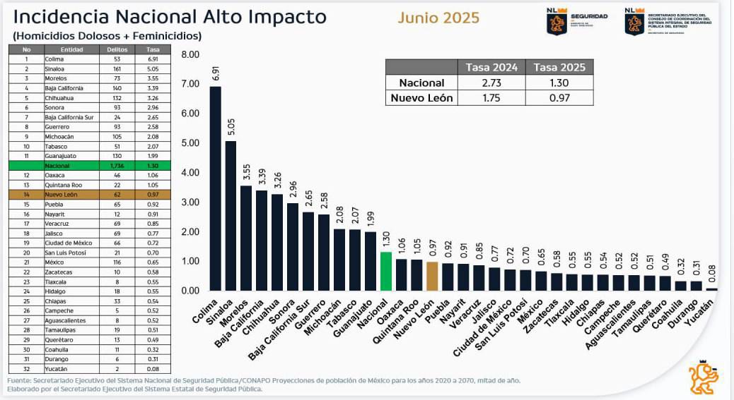 De acuerdo con cifras oficiales del Gobierno federal, al cierre del primer semestre de 2025, la entidad ocupa el lugar número 14 a nivel nacional en homicidios dolosos y feminicidios, mejorando notablemente su posición respecto al mismo periodo del año pasado, cuando se ubicaba en el cuarto lugar.