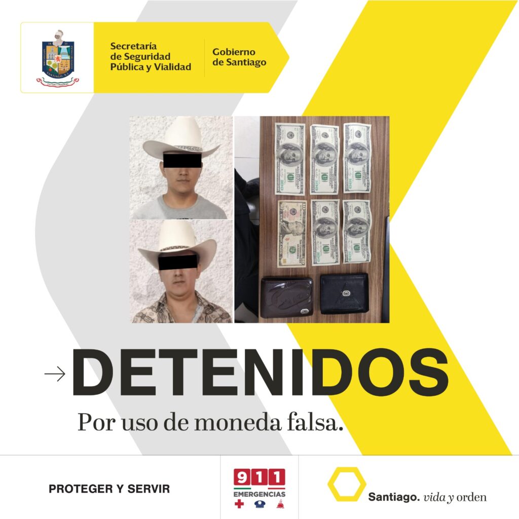 La oportuna intervención de elementos de la Secretaría de Seguridad Pública y Vialidad de Santiago permitió la detención de dos hombres que presuntamente intentaron realizar pagos con billetes falsos en un negocio ubicado en la Colonia Los Fierros.
