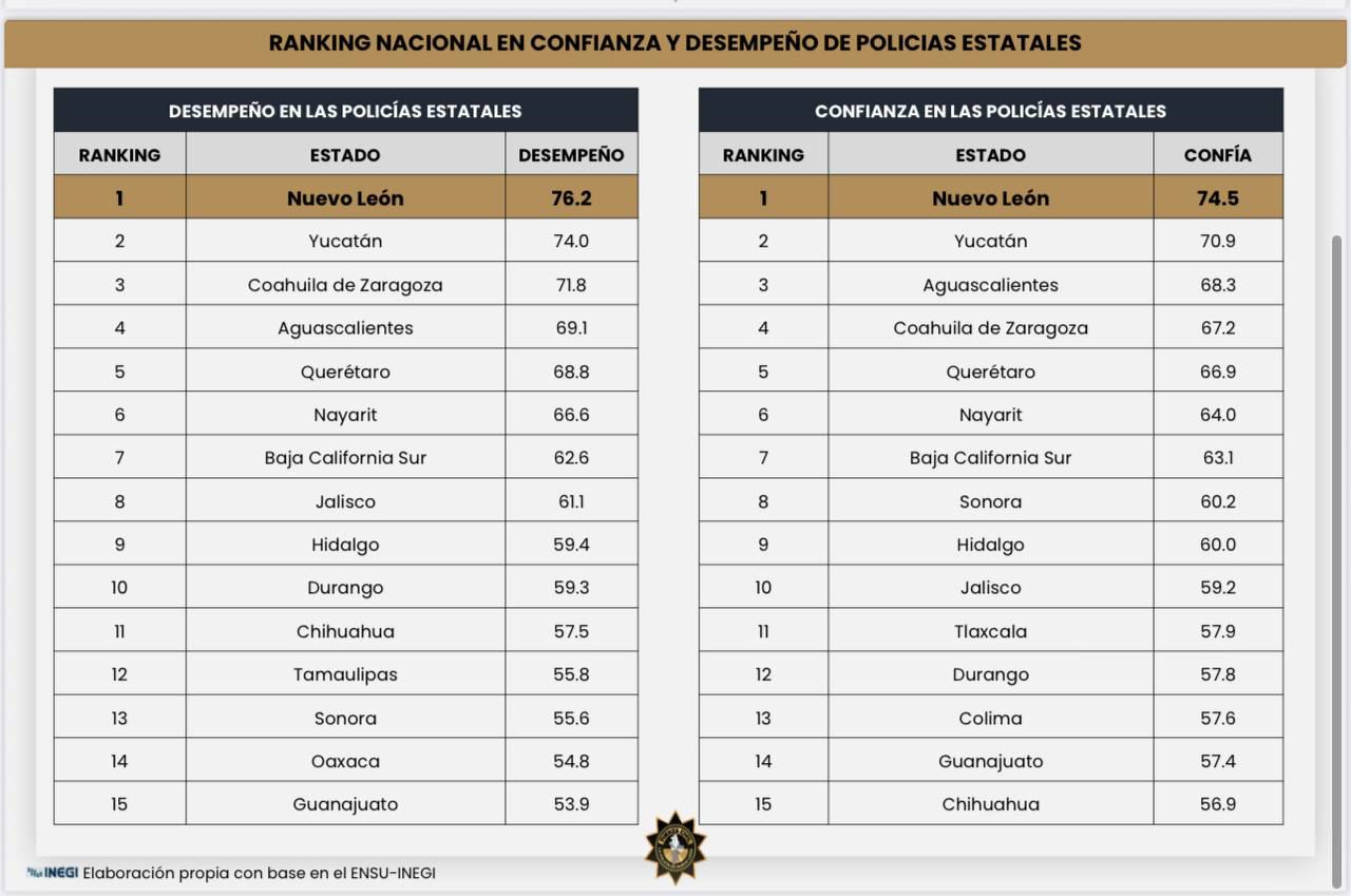 La Nueva Fuerza Civil se consolidó como la mejor policía estatal del país, al obtener las más altas calificaciones en confianza y desempeño ciudadano, de acuerdo con la más reciente edición de la Encuesta Nacional de Seguridad Pública Urbana (ENSU), publicada hoy por el INEGI.