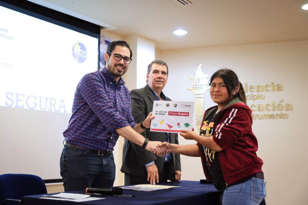 El Alcalde de Santiago, David de la Peña Marroquín, encabezó este miércoles la entrega de nuevas becas del programa “Prepa Segura”, beneficiando a 67 estudiantes de nuevo ingreso en la Preparatoria No. 20 de la Universidad Autónoma de Nuevo León.