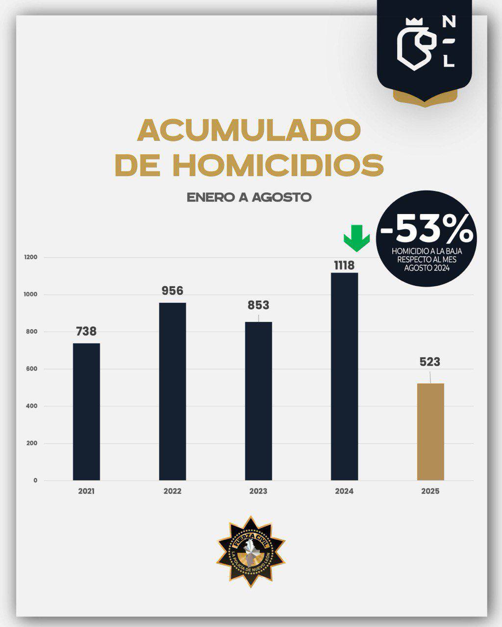 A dos días de cerrar agosto, los homicidios dolosos en Nuevo León cayeron 68% respecto al mismo mes de 2024, con 52 casos frente a 160. En lo que va del año, se acumulan 523 homicidios, 53% menos que en el mismo periodo del año pasado.