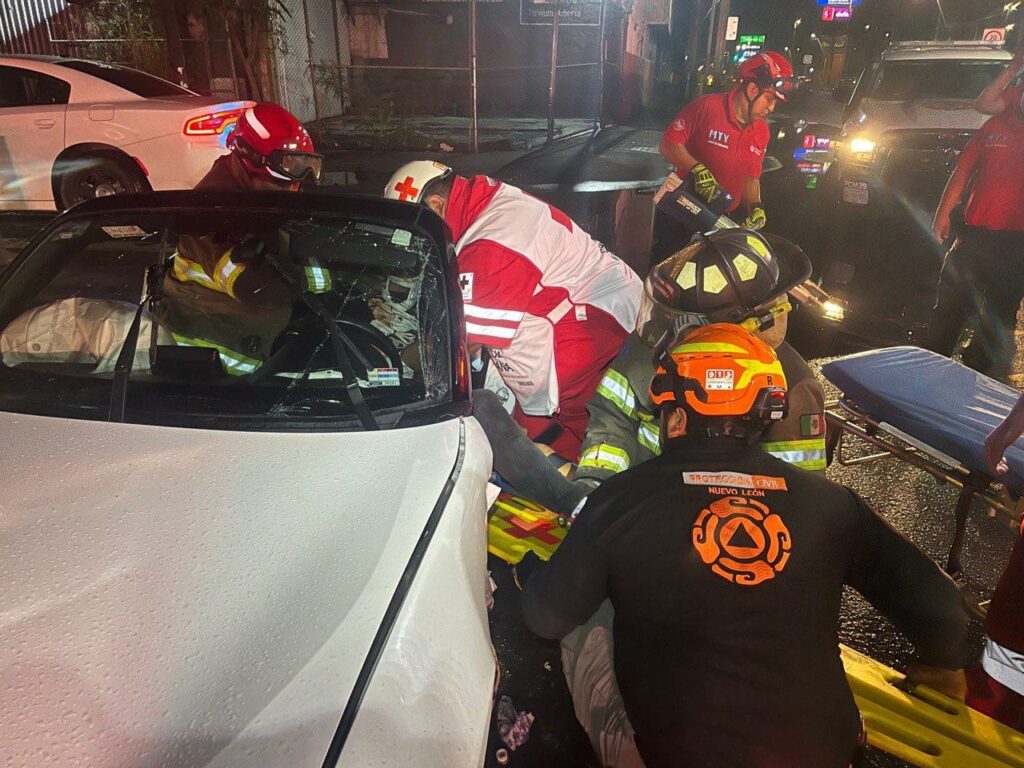 El conductor de un vehículo compacto, quedó prensado al interior de este, luego de protagonizar un aparatoso estrellamiento, la madrugada de este lunes en la colonia Del Prado, en el Municipio de Monterrey.