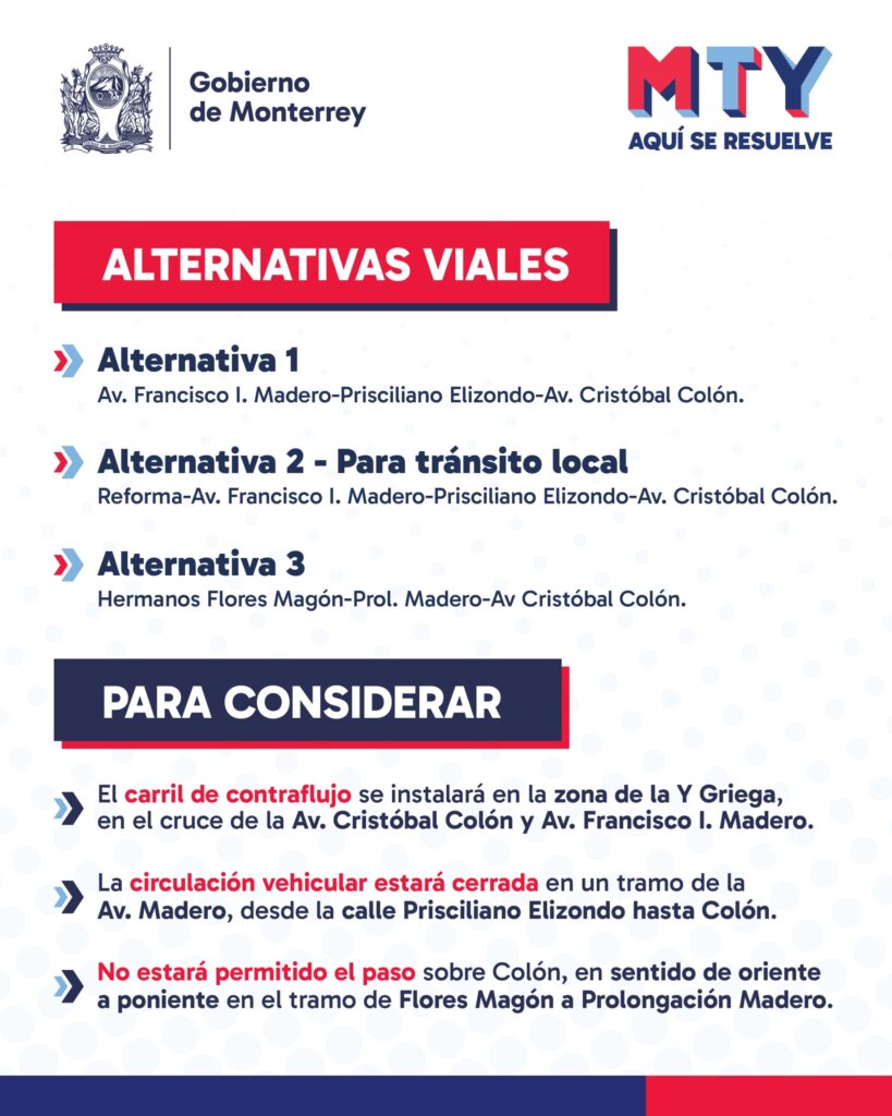 El dispositivo vial se ubicará en el cruce de las avenidas Cristóbal Colón y Francisco I. Madero, donde permanecerá cerrado un tramo de Madero, de Prisciliano Elizondo a Colón, así como Colón en sentido oriente-poniente entre Flores Magón y Prolongación Madero.