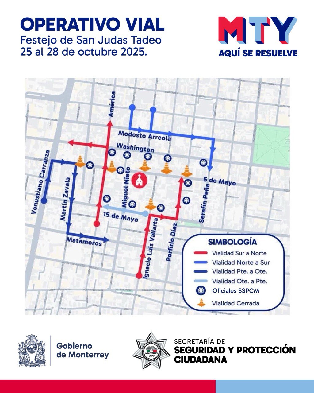 A partir del viernes 24 de octubre la Secretaría de Seguridad y Protección Ciudadana de Monterrey implementará un operativo vial y de seguridad en calles del centro del municipio de Monterrey, por los festejos a San Judas Tadeo.