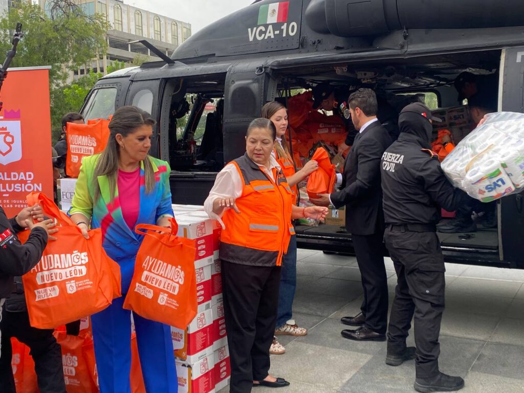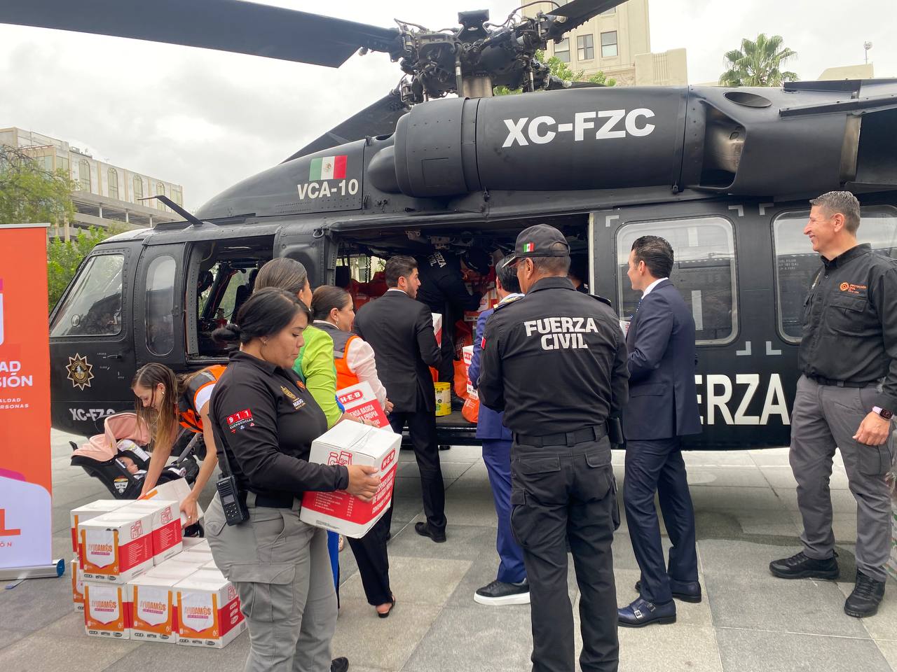 Despensas, kits de limpieza, artículos de primera necesidad, pañales y alimento para bebés, así como bebidas, fueron cargados en el Black Hawk de Fuerza Civil, el cual partió de la Explanada Cultural del Palacio de Gobierno.