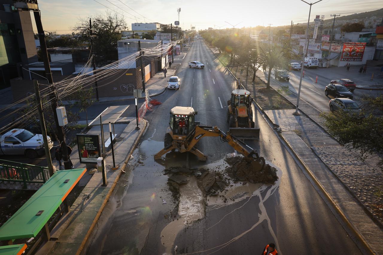Servicios de Agua y Drenaje de Monterrey arrancó los trabajos de reparación de una fuga de agua potable en una tubería de concreto de 72 pulgadas la mañana de este viernes en la Avenida Eloy Cavazos y 15 de mayo, a la altura de la colonia Las Villas en Guadalupe.