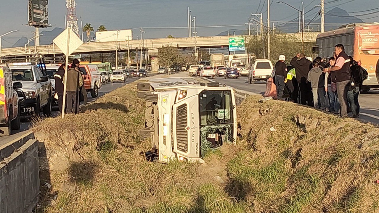 Protección Civil Nuevo León informó que en el camión de transporte de personal viajaban 16 pasajeros, de los cuales ocho resultaron con lesiones leves, pero que requirieron su traslado a un hospital.