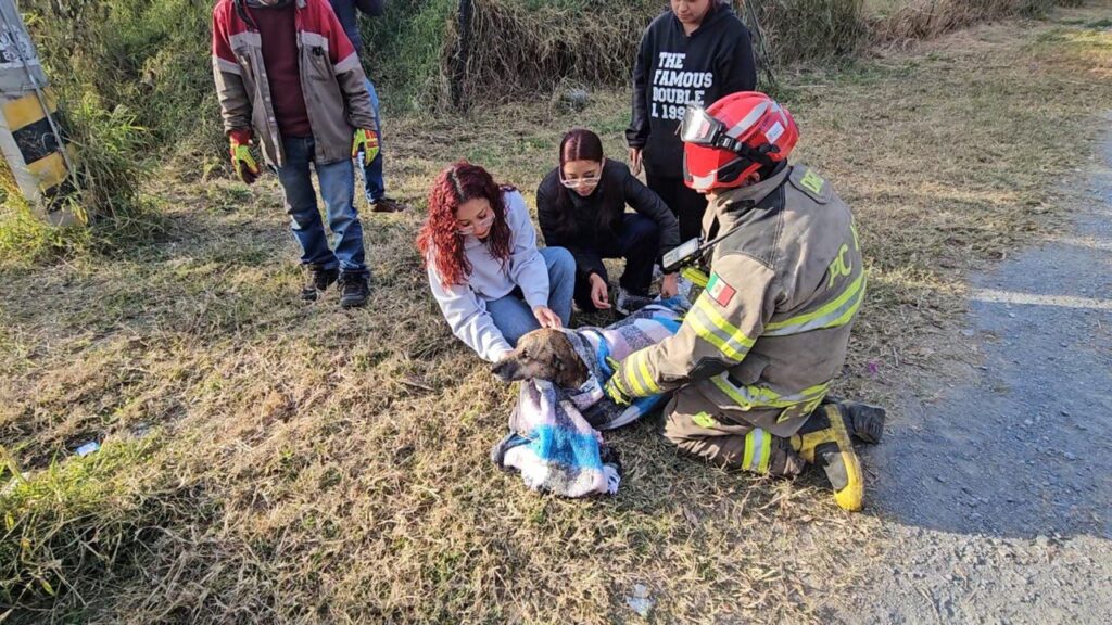 Una can de nombre “Pinta” fue rescatada por elementos de Protección Civil de Monterrey, luego de que cayera al interior de una noria de 15 metros de fondo aproximadamente, con 5 metros de agua de profundidad.