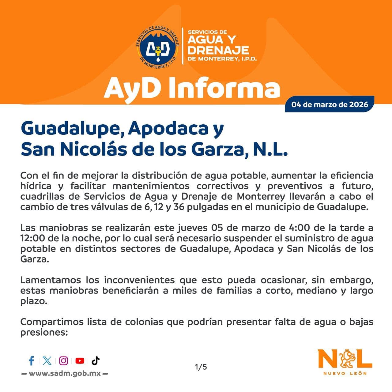 Las maniobras se realizarán este 5 de marzo, de 16:00 a 12:00 horas, por lo que se suspenderá el suministro de agua en distintos sectores de Guadalupe, Apodaca y San Nicolás.