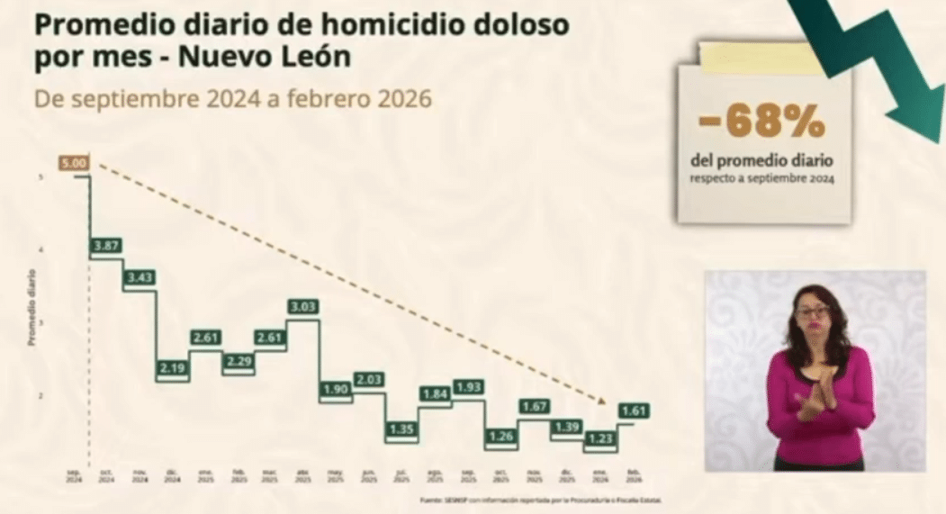 Nuevo León se colocó nuevamente como ejemplo nacional al reportar una reducción del 68 por ciento en el promedio diario de homicidios dolosos durante febrero de 2026, esto al pasar de 5 homicidios a 1.61.